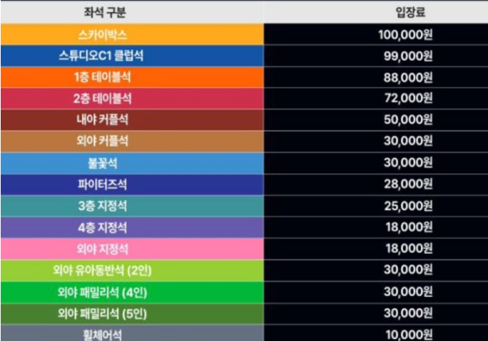 성공적인 고척돔 좌석 추천 예매를 위해 가격대도 미리 확인하세요. 1층 테이블석은 약 88,000원, 응원석(불꽃석)은 30,000원 수준입니다. 자신이 원하는 직관 스타일(응원 vs 관람)에 맞춰 위에서 제안한 고척돔 좌석 추천 명당을 선점하시기 바랍니다 (2025년 기준)