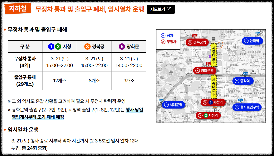 - 지하철 무정차: 광화문역(14시~22시), 시청·경복궁역(15시~22시) 역사 폐쇄