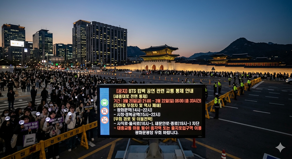 - 2026년 3월 21일 개최되는 BTS 컴백 공연으로 인해 광화문 일대 세종대로가 33시간 동안 전면 통제되며, 지하철 주요 역사가 폐쇄되는 등 유례없는 교통 혼잡이 예상됩니다. 공연 관람객뿐만 아니라 주말 도심 이동 계획이 있는 시민분들도 반드시 통제 시간과 우회 경로를 미리 파악해야 발이 묶이는 상황을 방지할 수 있습니다.