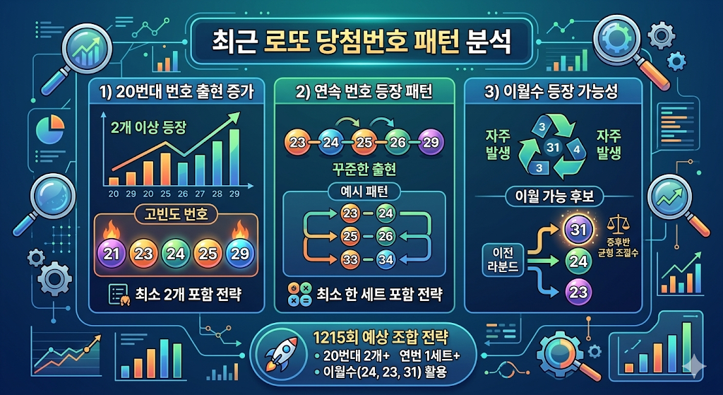이러한 흐름을 고려하면 로또 1215회에서도 20번대 번호를 최소 2개 이상 포함하는 전략이 유리할 수 있습니다.