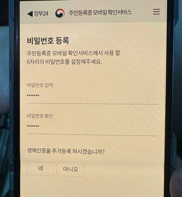 마지막으로 주민등록증 모바일 확인서비스에서 사용할 비밀번호 6자리를 입력해 주시고요. 지문 등 생체인증을 추가 등록할 수도 있습니다.