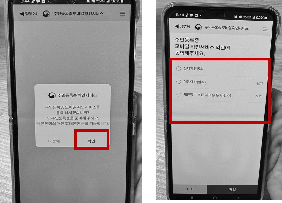 이미 등록했는데 휴대폰을 변경하신 분들은 '등록된 정부24 앱'이 아니라는 메시지와 함게 재등록을 하겠냐는 팝업이 나옵니다. 약관은 모두 필수이니 '전체약관동의'를 누른 후 하단에 '확인'을 눌러 주세요.