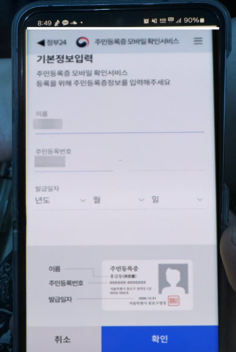 본인의 이름과 주민등록번호, 주민등록증 발급일자를 모두 입력한 후 '확인'을 눌러 주세요.