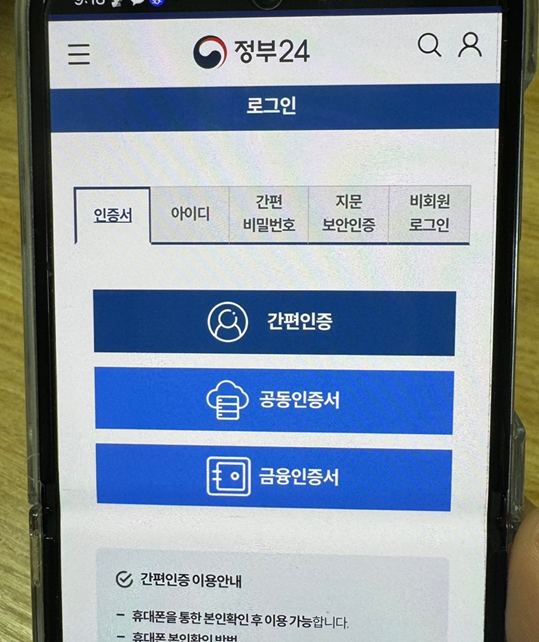 회원 가입 후 아이디/비밀번호를 넣으신 후 로그인도 가능하고 간편인증/공동인증서/금융인증서 등을 통해 로그인도