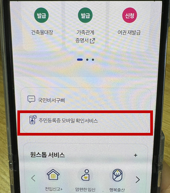 로그인을 한 후 화면을 아래로 내리면 '주민등록증 모바일 확인 서비스'가 보이는데 그걸 터치해주시고