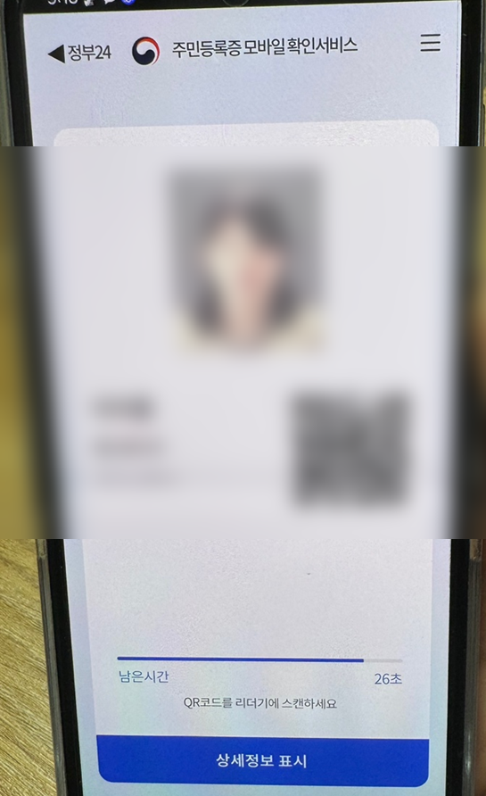 정부24 앱에서 모바일 주민등록증 발급이 완료된 모습입니다. QR코드를 리더기에 스캔해서 사용할 수 있고, 파란색 '상세정보 표시'를 누르면 주소 등 상세정보 확인도 가능합니다.