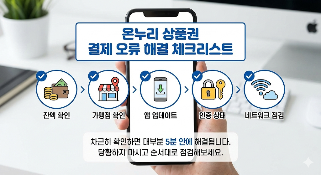 아래에서 온누리 상품권 결제 오류 해결방법 5가지를 원인별로 정리해 드립니다.