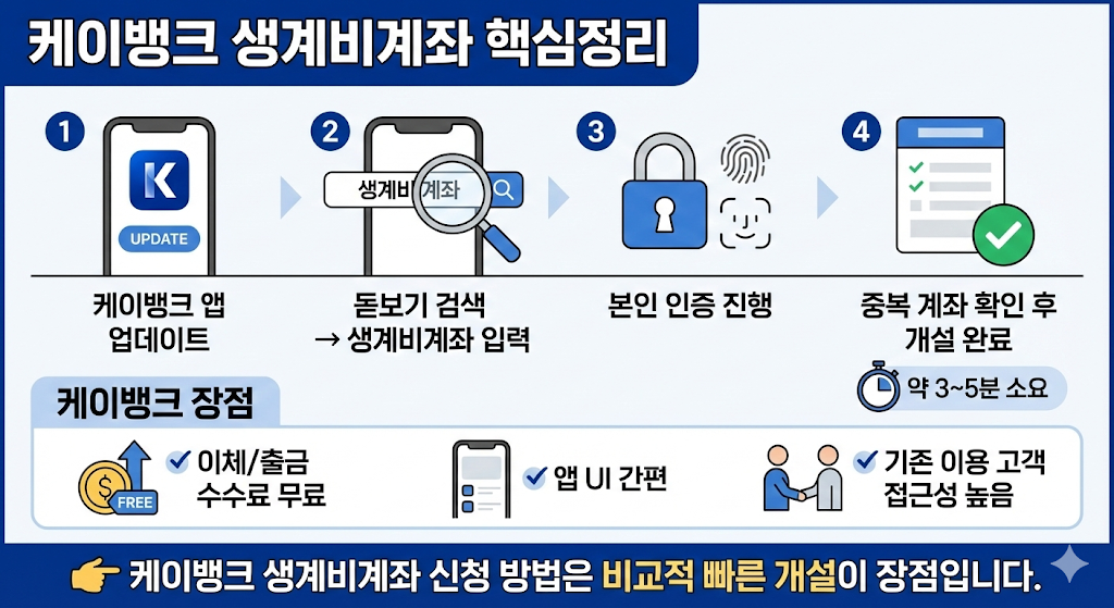 👉 케이뱅크 생계비계좌 신청 방법은 비교적 빠른 개설이 장점입니다.