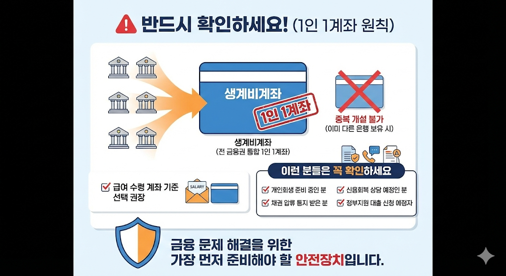 특히 금융 문제를 겪고 있다면 생계비계좌 신청은 가장 먼저 준비해야 할 안전장치입니다.
