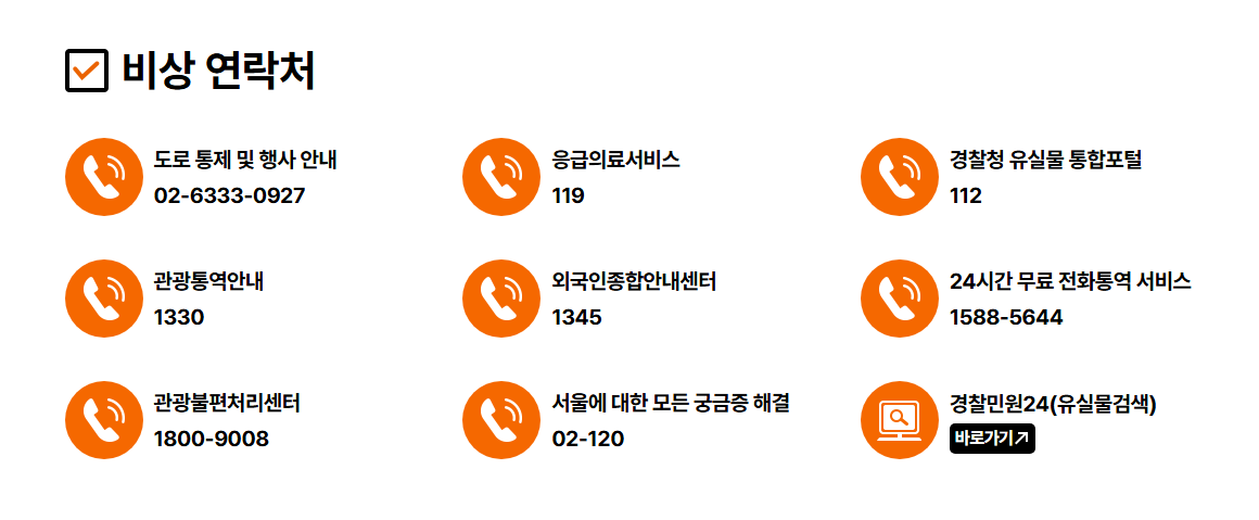 | 치안 및 범죄 신고 | 112 | 도난, 미아, 범죄 예방 |