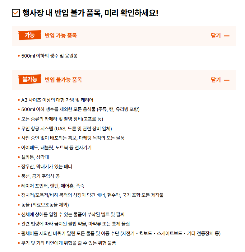 1. 행사장 내 반입 불가 품목: 입구에서 회수되지 않도록 주의하세요