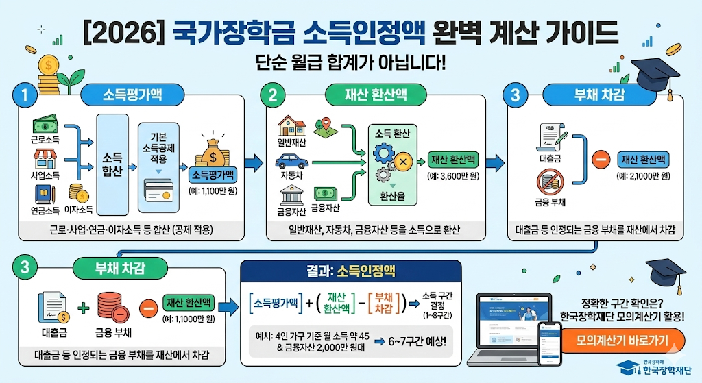 국가장학금 수혜 여부를 결정하는 소득인정액은 단순 월급 합계가 아닙니다. 아래의 복합적인 구조로 계산됩니다.