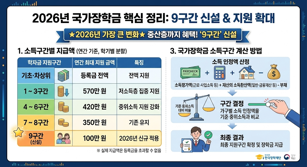 [2026 최신] 2026년 국가장학금 2차 신청 기간(3월 17일 마감)과 소득구간별 지급액을 완벽 정리해 드립니다. 특히 9구간 신설로 확대된 지원 범위와 소득인정액 계산법 등 대학생들이 가장 궁금해하는 핵심 정보를 모아 학비 고민을 시원하게 해결해 드립니다.
